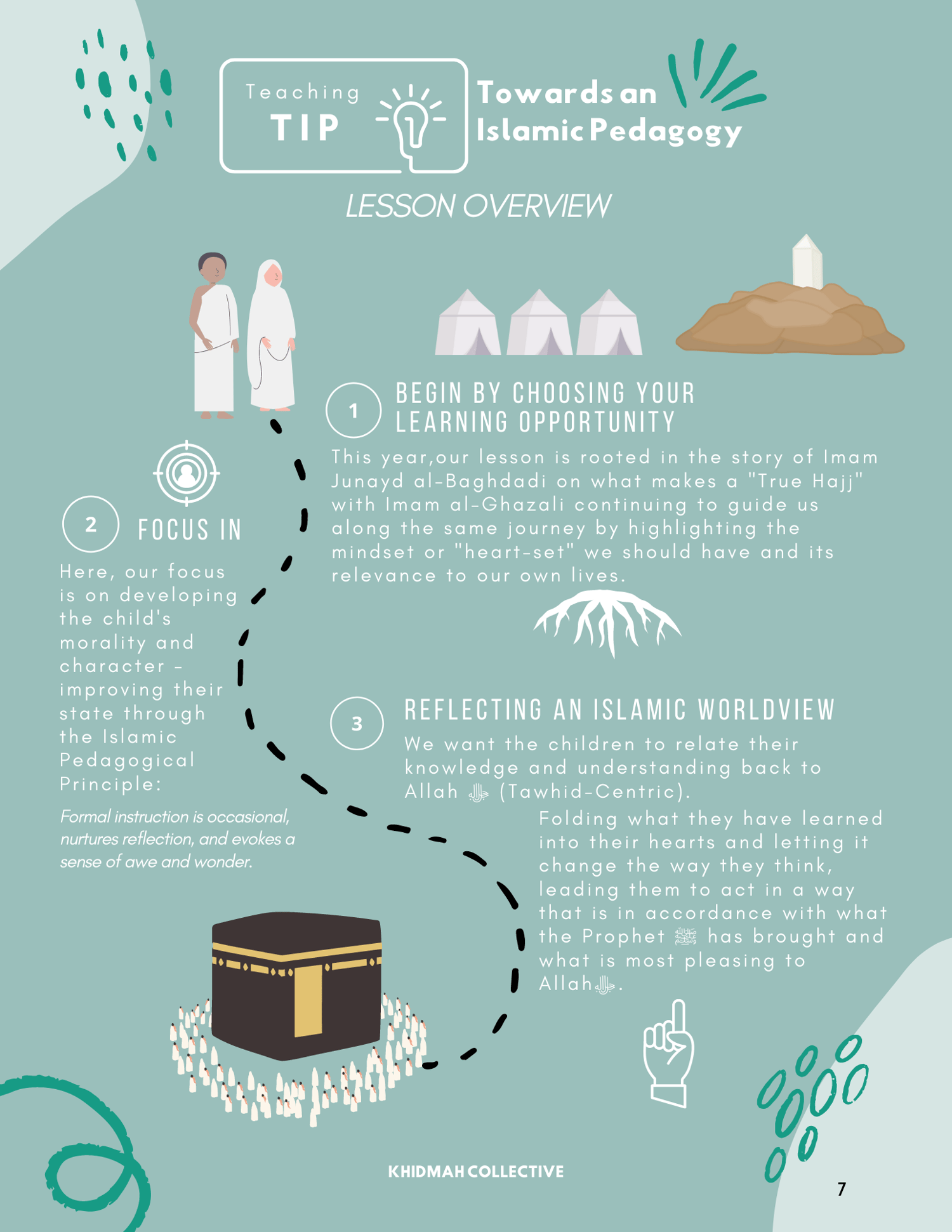 By taking the journey along with these two incredible guides: Imam Junayd al-Baghdadi and Imam Al-Ghazali it is hoped that our children come to understand the purpose of the Hajj. InshaAllah, allowing them to fold what they have learned into their hearts, letting it change the way they think, and leading them to act in obedience to what the Prophet ﷺ has conveyed and what is most pleasing to Allah ﷻ.