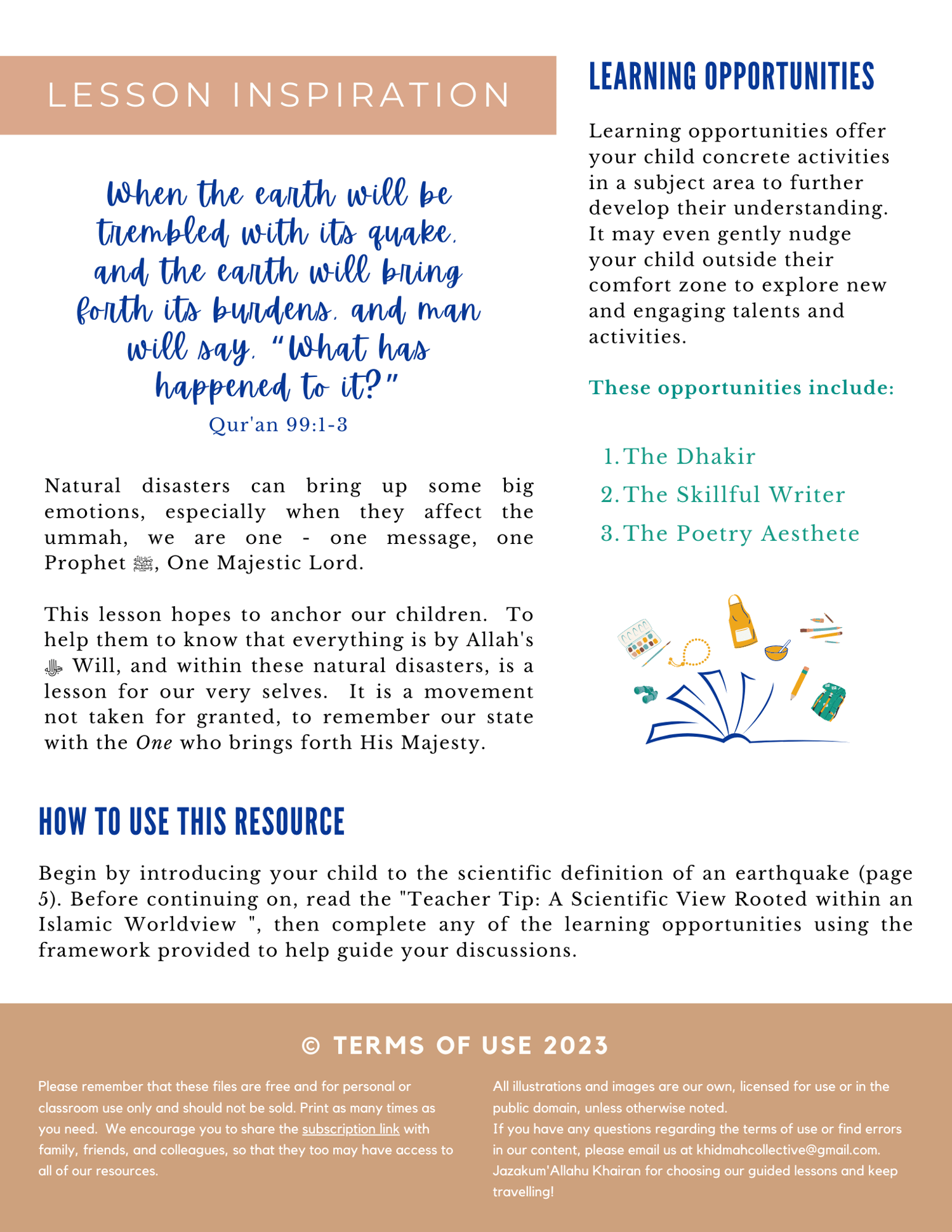 This is a 21-page lesson hoping to anchor our children, to help them know that everything is by Allah's ﷻ Will, and within these natural disasters, is a lesson for our very selves. It is a movement not taken for granted, to remember our state with the One who brings forth His Majesty.